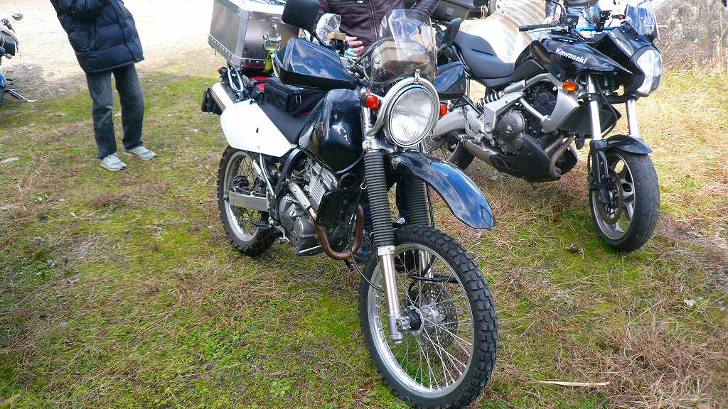 入ったところになにやらバイクが並んでおりまして、多分これなんだろうなあと思いつつも、ほかに停めるところは無いかなと奥まで行くとどっかで見たことのある箱の付いたオフ車がある。